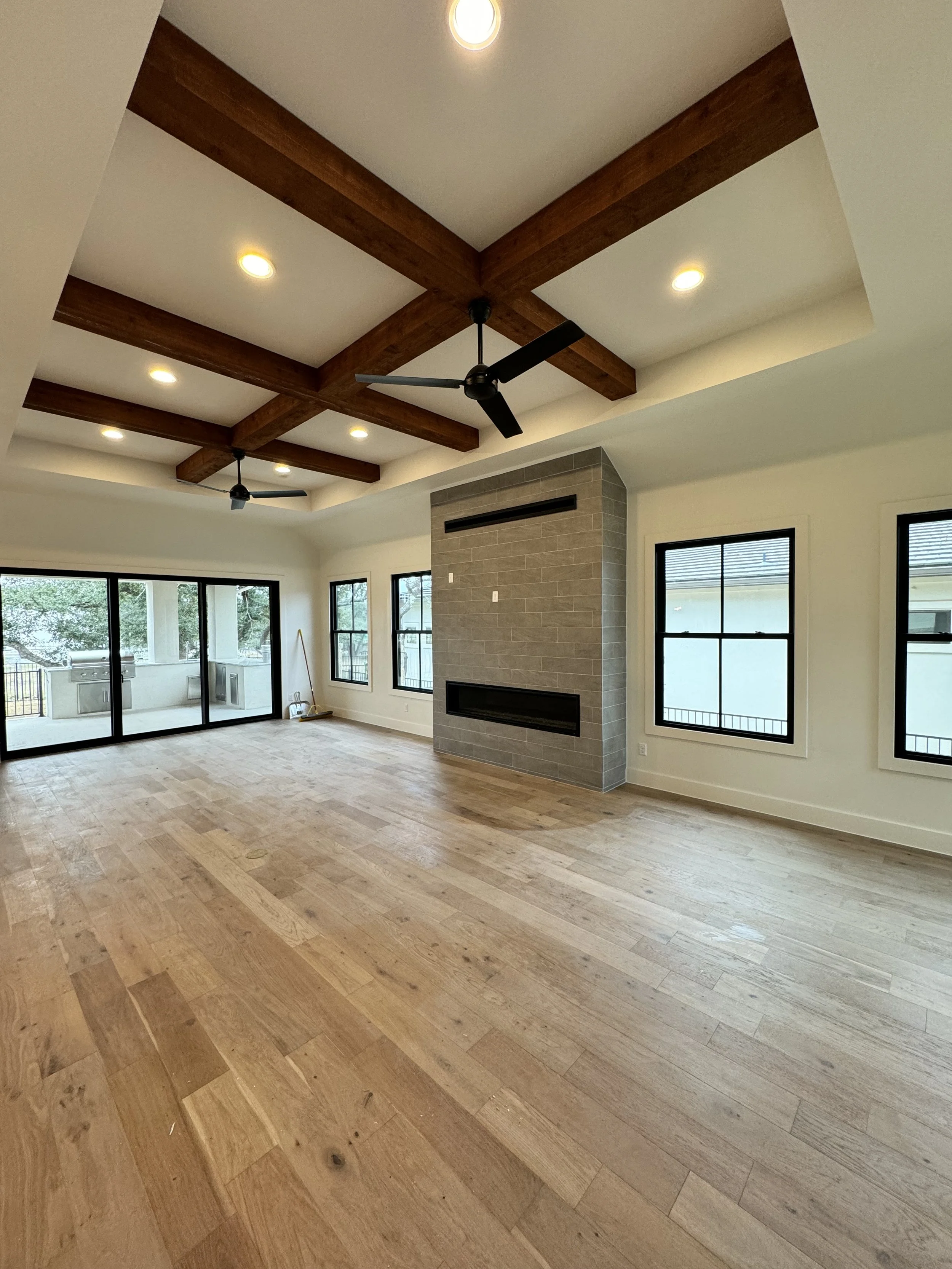 beam wrap, flooring and electric fireplace build.