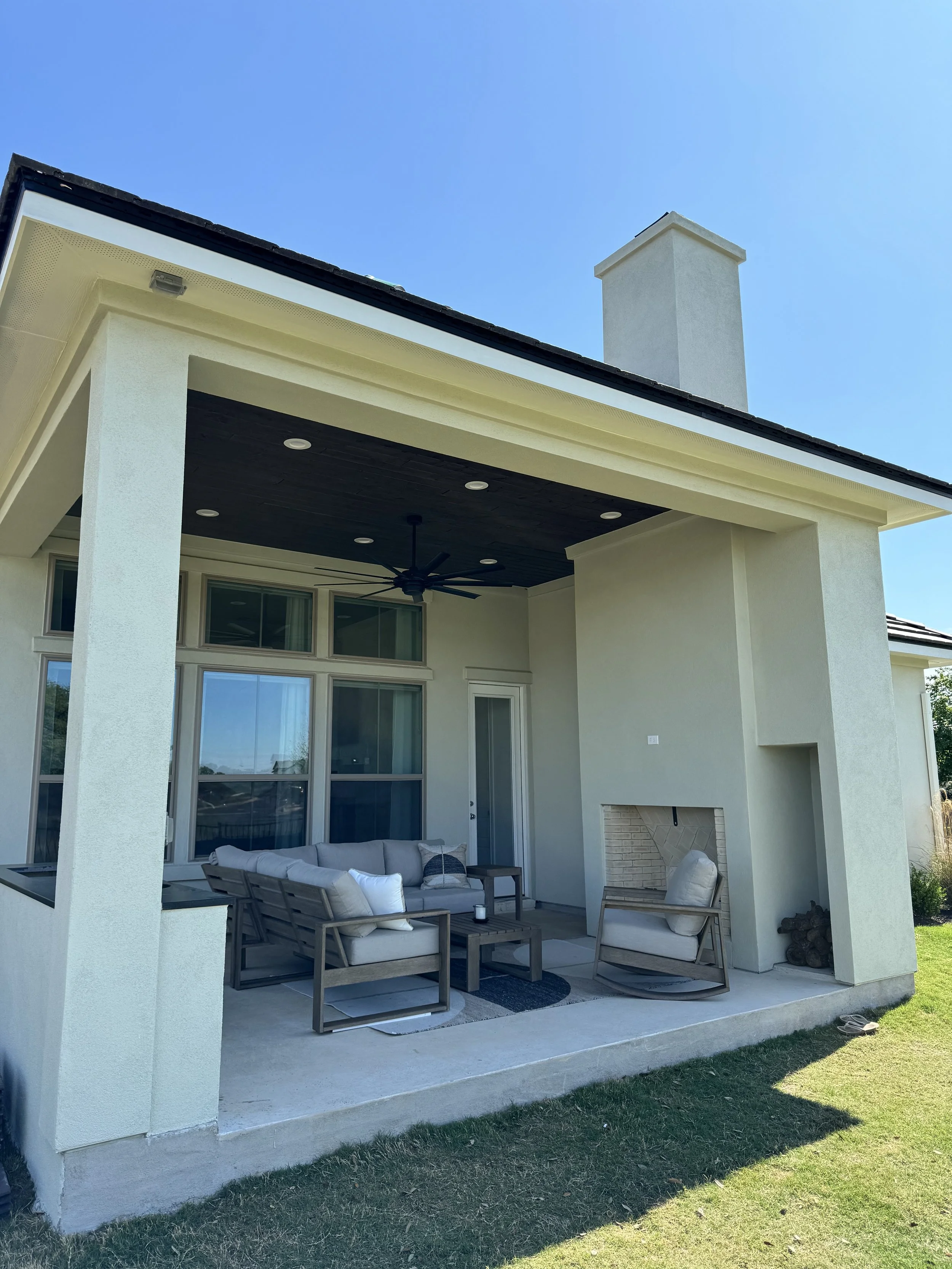 full roof patio extension with full outdoor kitchen and fireplace.